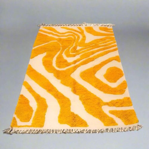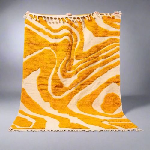 Abstract Yellow Cream Wavy Stripe Hand Knotted Moroccan Rug